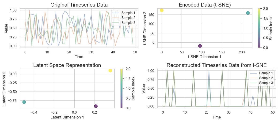 In this implementation, we generate synthetic time series data, train a VAE to learn latent representations, and use t-SNE (t-distributed Stochastic Neighbor Embedding) to visualize the lower-dimensional embeddings. We’ll also reconstruct the data to see how well the VAE performs in recreating the original time series.
